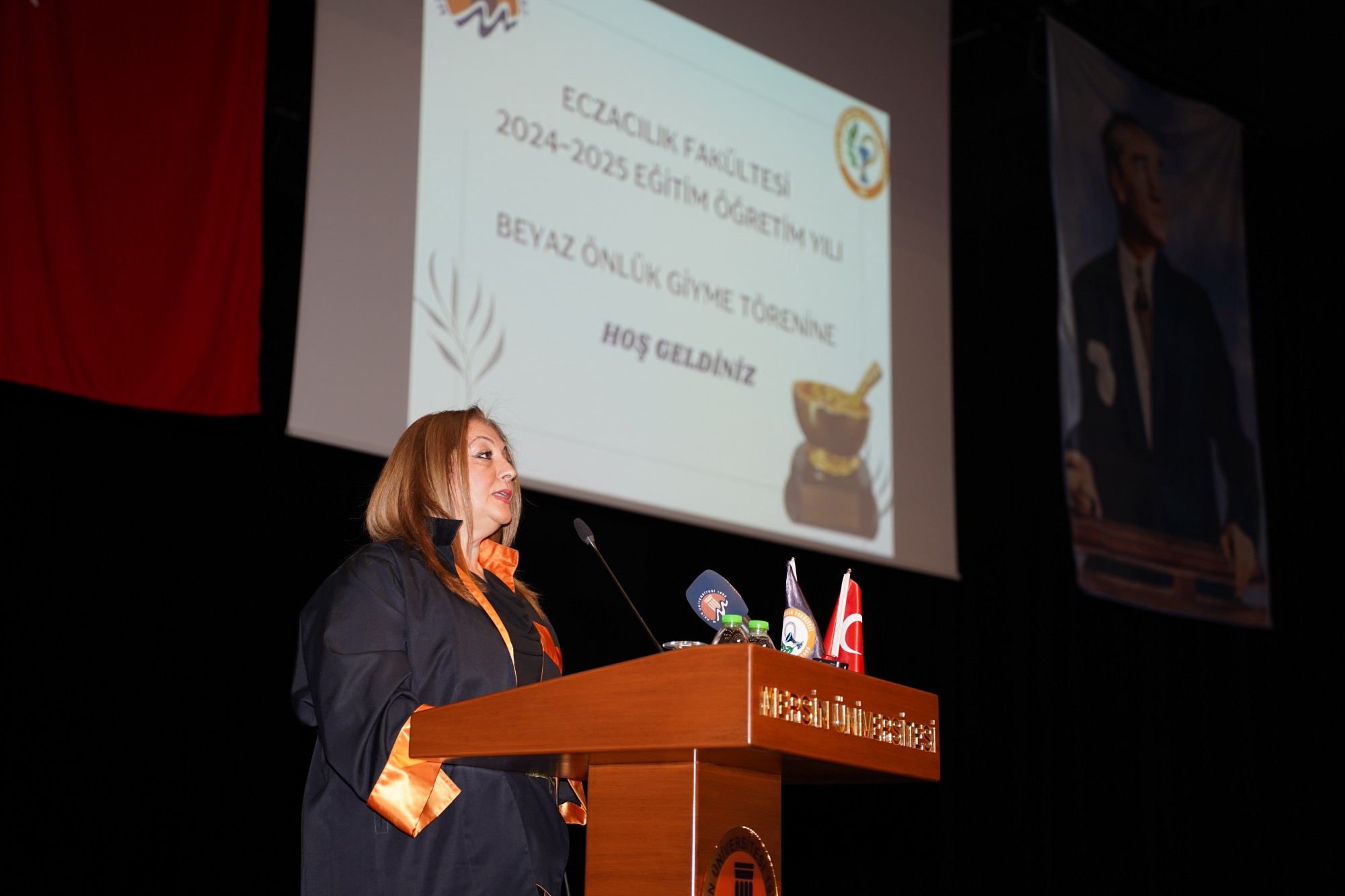 Sözlerine Üniversitemizi ve Fakültemizi tercih ederek aramıza katılan öğrencilerimizi tebrik ederek başlayan Fakültemiz Dekanı Prof. Dr. Necmiye CANACANKATAN, “Bu başarının her aşamasında evlatlarının yanında yer alan siz değerli aileleri de özellikle kutluyorum. Mersin Üniversitesi ailesine, aramıza hoş geldiniz. Sevgili öğrenciler biraz sonra beyaz önlüklerinizi giyerek aslında bu önlüğün temsil ettiği saflık, temizlik, dürüstlük, bilgelik ve vicdan sahibi olmak gibi değerleri üstlenerek mesleki eğitiminize ilk adımınızı atıyorsunuz. Eczacılık mesleğinin saygınlığını ve sorumluluğunu gelecekte de Mersin Üniversitesi Eczacılık Fakültesi mezunları olarak en iyi şekilde taşıyacağınızdan eminim." dedi.