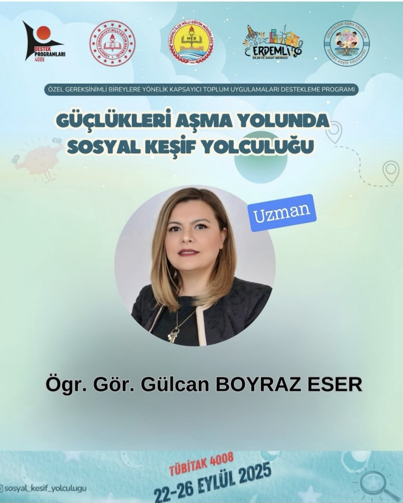 TÜBİTAK 4008 "Güçlükleri Aşma Yolunda Sosyal Keşif Yolculuğu" Projesinde  Uzman olarak yer alacak olan Öğr. Gör. Gülcan BOYRAZ ESER tarafından özel öğrenme güçlüğü olan öğrencilerimizin sosyal gelişimini sağlamaya yönelik etkinlik çalışmaları gerçekleştirilecektir.