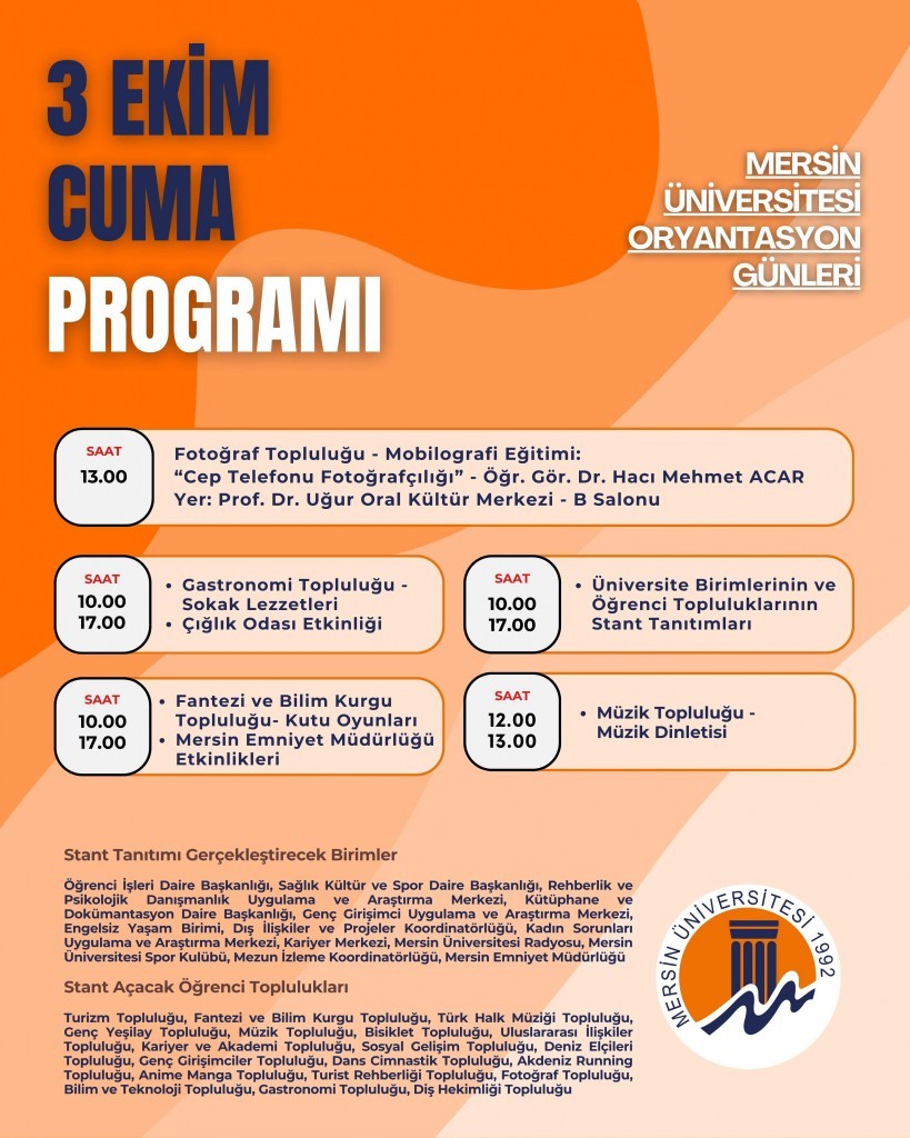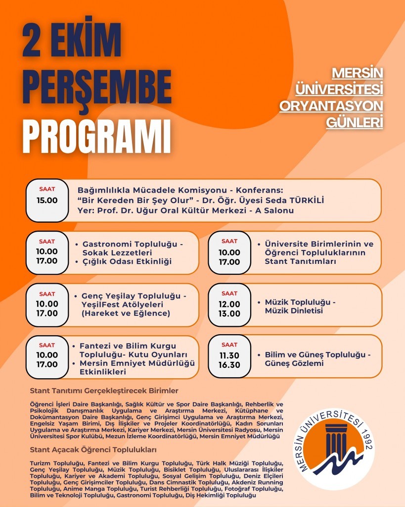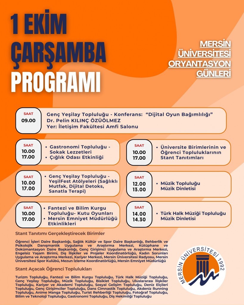 Mersin Üniversitesi ailesine yeni katılan öğrencilerimiz için üniversitemiz tarafından hazırlanan oryantasyon programı 01-03 Ekim 2025 tarihlerinde gerçekleştirilecektir.