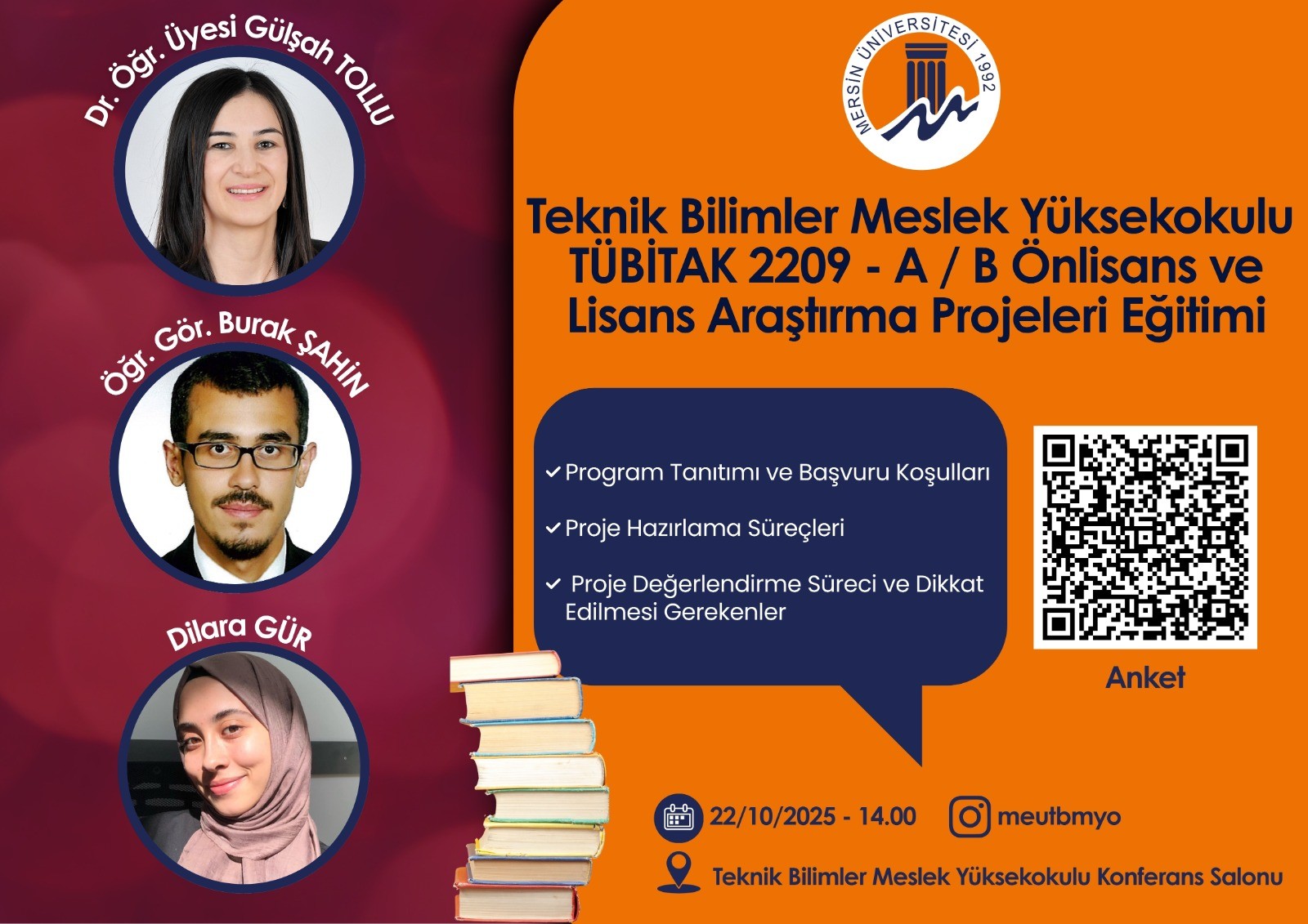 Mersin Üniversitesi Teknik Bilimler Meslek Yüksekokulu tarafından, öğrencilerin bilimsel araştırma ve proje kültürünü geliştirmek amacıyla “TÜBİTAK 2209-A/B Önlisans ve Lisans Araştırma Projeleri Eğitimi” düzenlendi.