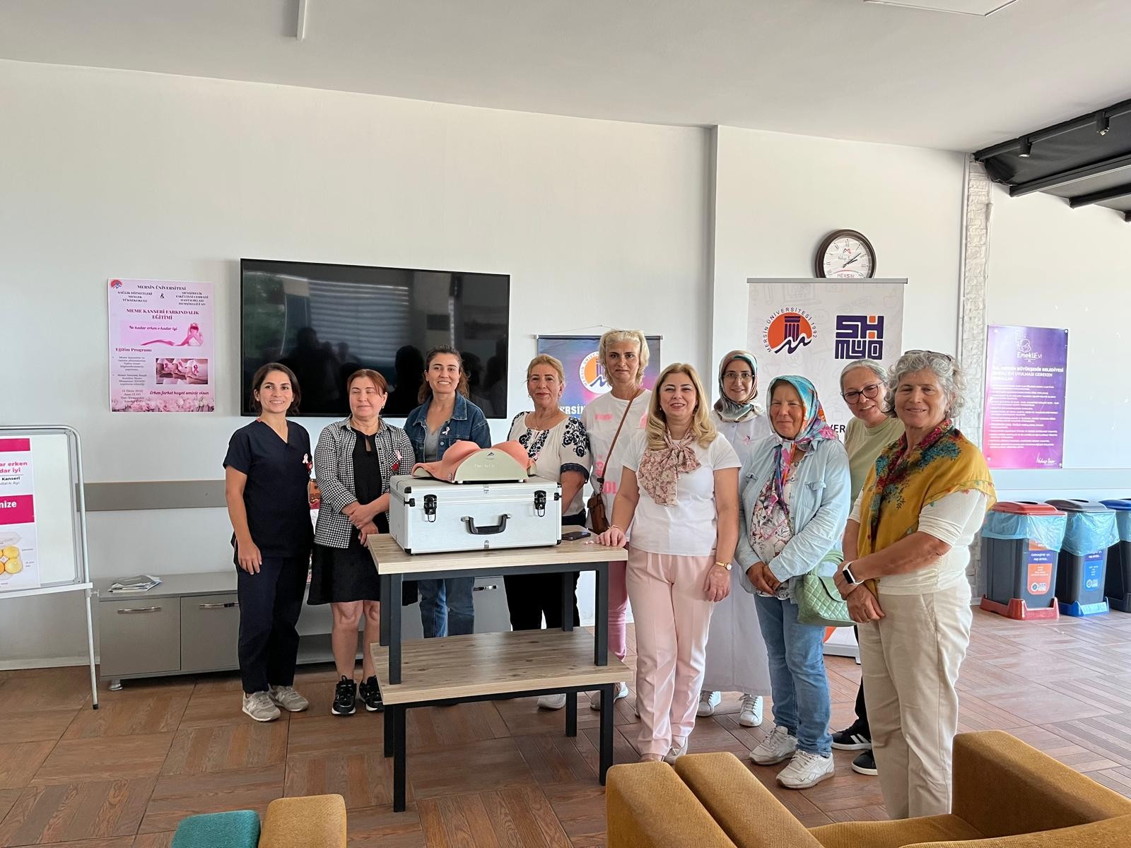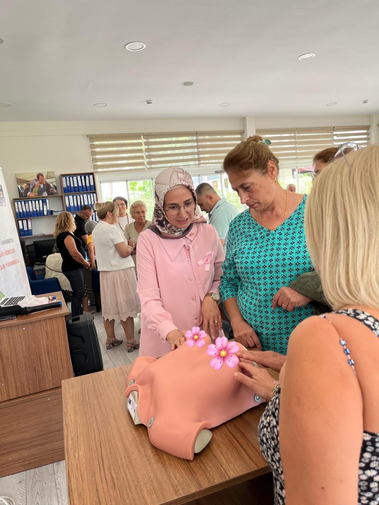 İlgili eğitimlerde Sağlık Hizmetleri Meslek Yüksekokulu’ndan Müdürümüz Prof. Dr. Gülay ALTUN UĞRAŞ,  Öğr. Gör. Fatma GÖK öğrencilerimizden Nisa DEMİRCAN ile Pirsu ALBAYRAK görev aldı. Verilen eğitimlerde meme kanserinde risk faktörleri, meme kanserinde erken tanının önemi, kendi kendine meme muayenesi yöntemleri ve düzenli taramaların yaşam kurtarıcı rolü anlatıldı. Eğitim sonunda, maket üzerinde nasıl meme muayenesi yapılacağı uygulamalı bir şekilde gösterildi ve katılımcılara meme muayenesi yaptırıldı.