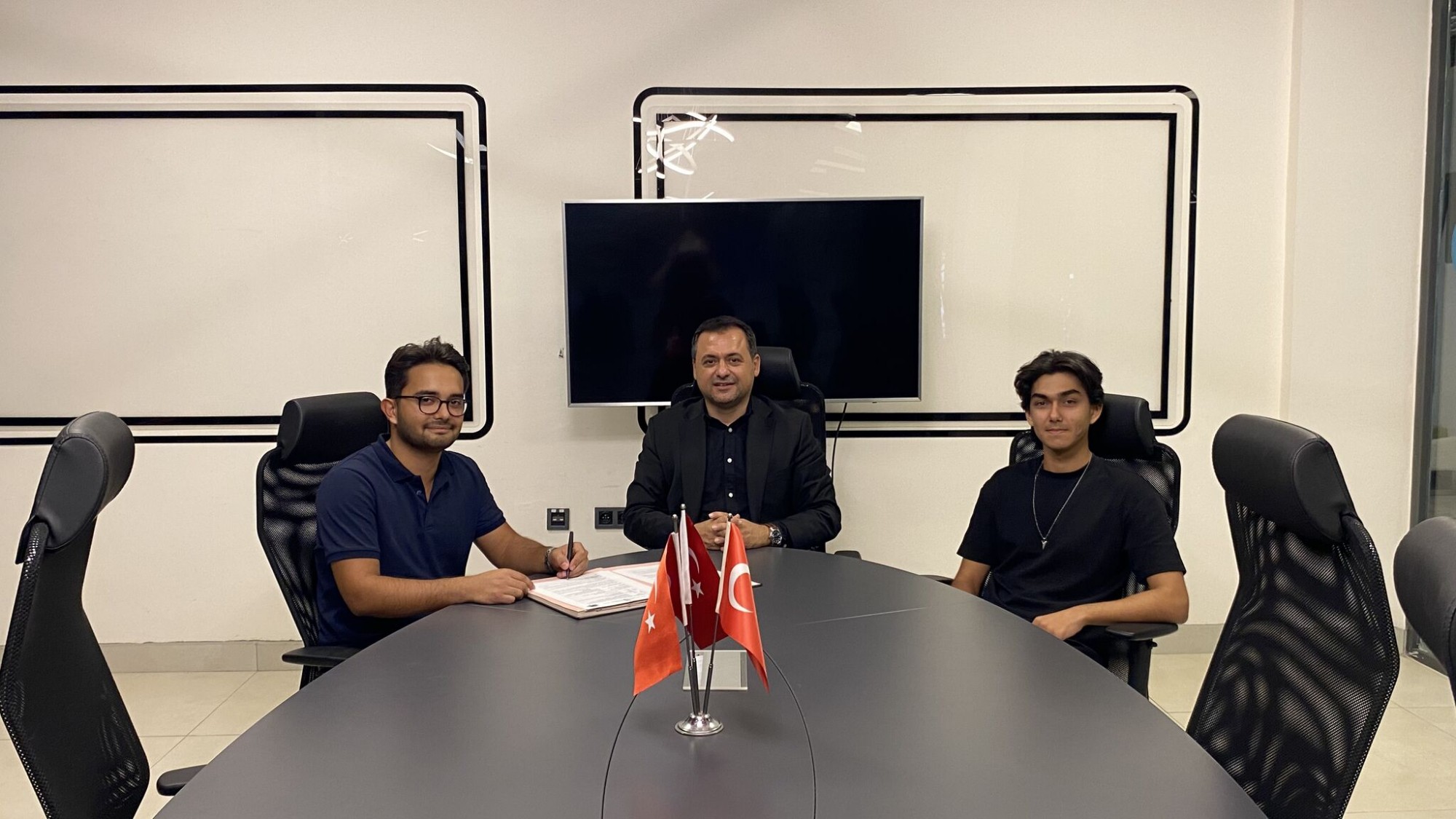 07 Kasım 2025 tarihinde, Mersin Üniversitesi Mühendislik Fakültesi Elektrik-Elektronik Mühendisliği Bölümü öğrencileri olan yeni girişimcilerimiz Talha AŞLAMACI ve Yuşa Berk ABACI, Merkezimizin sunduğu imkânlardan faydalanmak üzere Merkez Müdürümüz Dr. Öğr. Üyesi Gürbüz ÇOMAK ile karşılıklı olarak sözleşme imzalamışlardır.