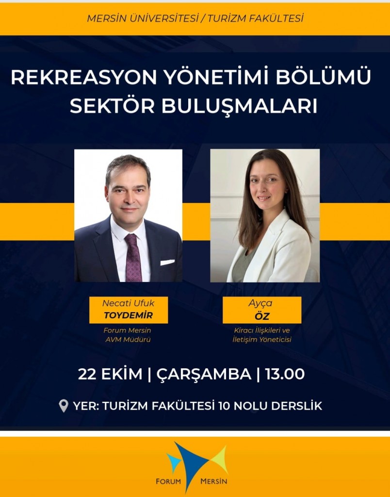 Rekreasyon Yönetimi Bölümü, 22.10.2025 tarihinde saat 13.00’te düzenlenen “Rekreasyon Yönetimi Sektör Buluşmaları”nın dördüncüsünde Forum AVM Yönetim Temsilcileri Necati Ufuk Toydemir ve Ayça Öz’ü konuk etti.