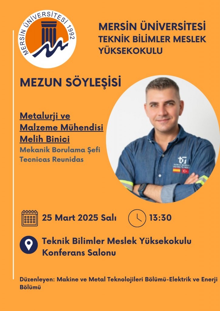 Makine ve Metal Teknolojileri Bölümü ve Elektrik ve Enerji Bölümü ortaklığıyla düzenlenen Mezun Söyleşisi etkinliğine, Makine programı 2010 yılı mezunumuz Metalurji ve Malzeme Mühendisi Melih BİNİCİ konuşmacı olarak katılarak, mezuniyet sonrası kariyer planlaması, iş hayatıyla ilgili tecrübelerini ve sektörel önerilerini öğrencilerimizle paylaşmıştır.