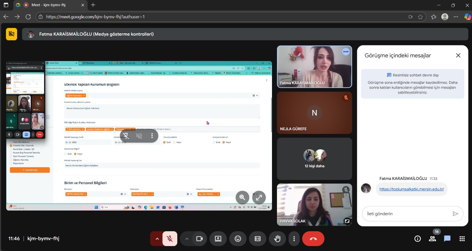 21.11.2025 tarihinde gerçekleştirilen toplantıda, Eğitim Fakültesi Toplumsal Katkı Temsilcisi Arş. Gör. Fatma Karaismailoğlu tarafından "Mersin Üniversitesi Toplumsal Katkı Yazılımı"nın tanıtımı yapılmış ve ardından uygulamalı olarak gösterilmiştir.