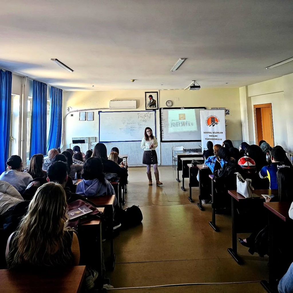 Eğitimde kadının hukuki hakları, Türk hukuk sisteminde yer alan yasal düzenlemeler, 6284 sayılı Kanun’un kapsamı, koruyucu ve önleyici tedbir kararları ile Kadın Destek Uygulaması (KADES) gibi dijital başvuru araçlarının kullanımına ilişkin bilgiler paylaşıldı. Öğrenciler, sahada çalışan bir sosyal çalışmacının deneyimlerini birinci elden dinleyerek mesleki rol ve sorumlulukların pratikte nasıl yürütüldüğüne dair önemli bir perspektif kazandı.