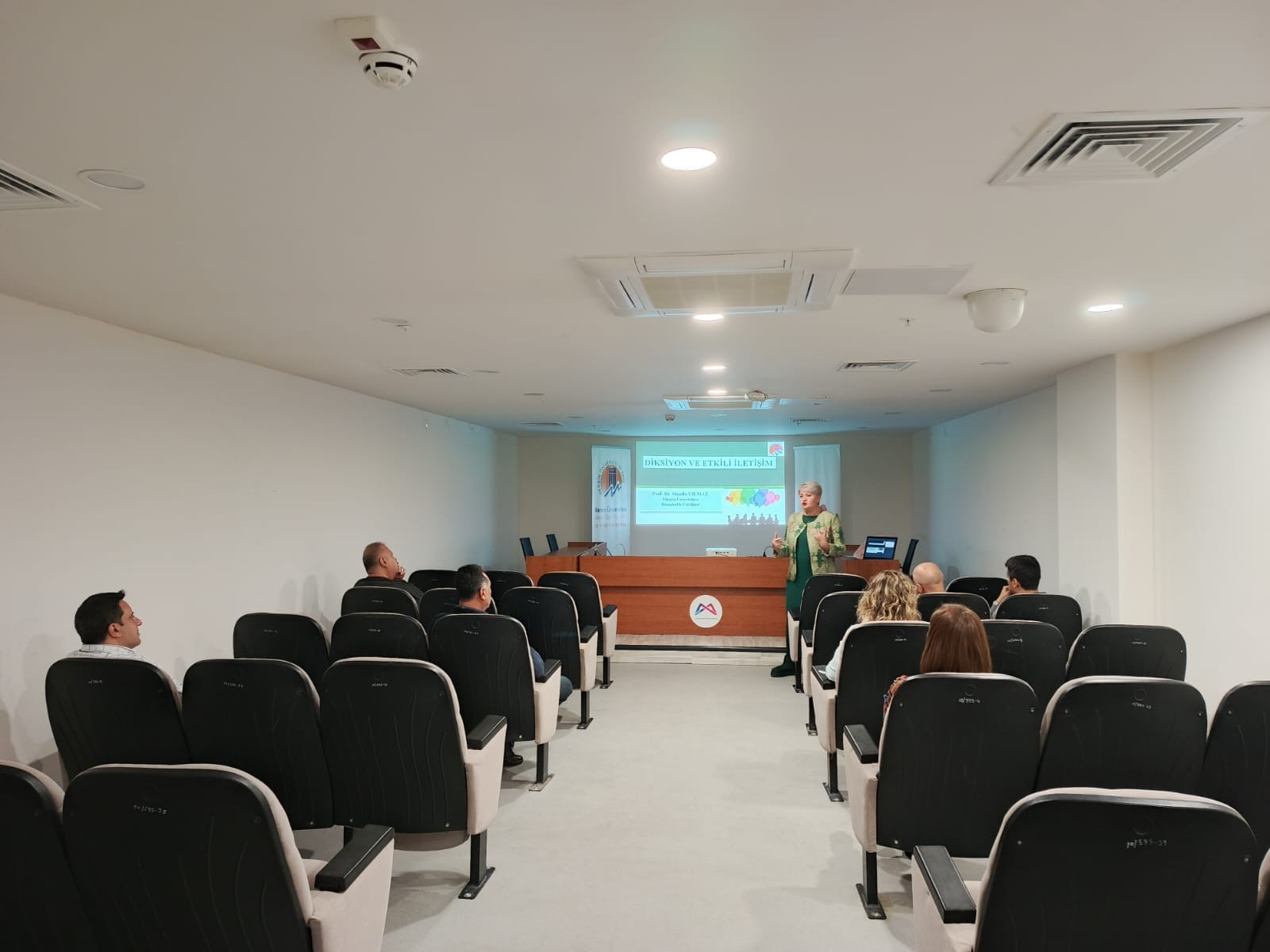 Prof. Dr. Mualla YILMAZ tarafından, 27 Kasım 2025 tarihinde, Mersin Büyükşehir Belediyesi çalışanlarına yönelik olarak “Diksiyon Eğitimi ve Etkili İletişim” konulu bir eğitim gerçekleştirilmiştir. Eğitim kapsamında; etkili iletişimin temel ilkeleri, doğru ve anlaşılır konuşmanın önemi, ses tonu ve vurgu kullanımı, beden dili ile sözel iletişim arasındaki ilişki ve iletişim becerilerinin geliştirilmesine yönelik uygulamalı örneklere yer verilmiştir.