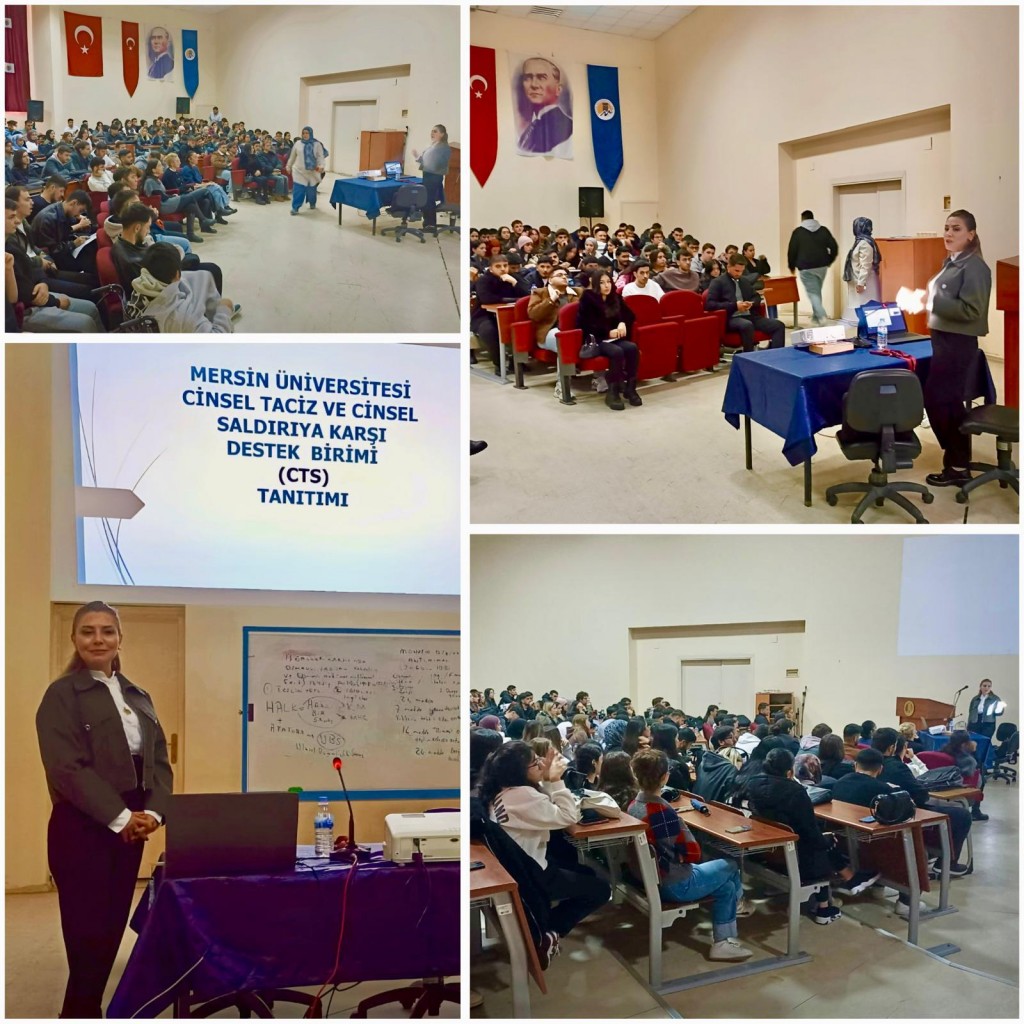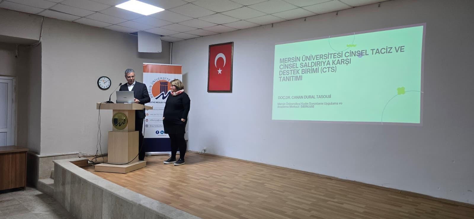 Mersin Üniversitesi Cinsel Taciz Ve Cinsel Saldırıya Karşı Destek Birimi (CTS) Tanıtımı Doç. Dr. Canan DURAL TASOUJİ Tarafından Silifke Meslek Yüksekokuluna, Öğr. Gör. Dr. M. Deniz ZÖHRE TÜRKMENOĞLU Tarafından Erdemli Meslek Yüksekokulu ve Erdemli Uygulamalı Teknoloji ve İşletmecilik Yüksekokuluna ,Arş. Gör. Dr. Özen KURTULUŞ tarafından Denizcilik Meslek Yüksekokuluna, Psikolog Pınar ÇALIŞGAN tarafından Gülnar Mustafa Baysan Meslek Yüksek Okuluna, Doç. Dr. Aysun YARALI AKKAYA Tarafından Anamur Meslek Yüksekokuluna Yapıldı.