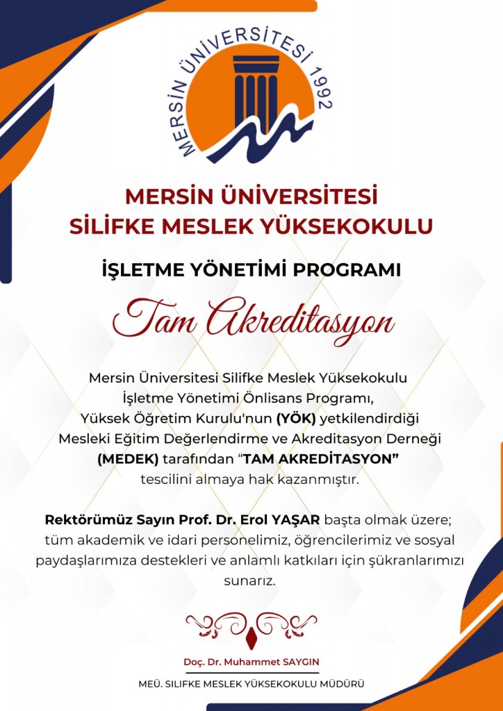 Yönetim ve Organizasyon Bölümü bünyesinde yürütülen İşletme Yönetimi Önlisans Programı, Yükseköğretim Kurulu (YÖK) tarafından yetkilendirilen Mesleki Eğitim Değerlendirme ve Akreditasyon Derneği (MEDEK) tarafından Tam Akreditasyon almaya hak kazandı.