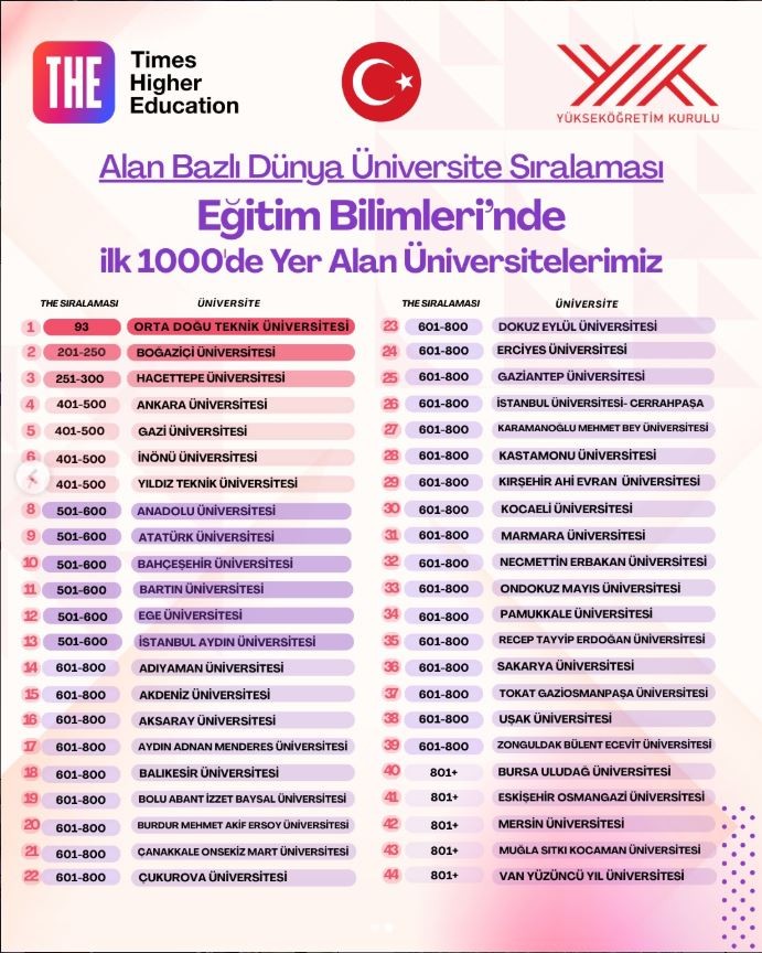Dünyanın en saygın yükseköğretim derecelendirme kuruluşlarından biri olan Times Higher Education (THE) tarafından açıklanan 'Alan Bazlı Dünya Üniversite Sıralamaları'nda üniversitemiz, Eğitim Bilimleri alanında dünyanın en iyi ilk 1000 üniversitesi arasında yer alma başarısını gösterdi.