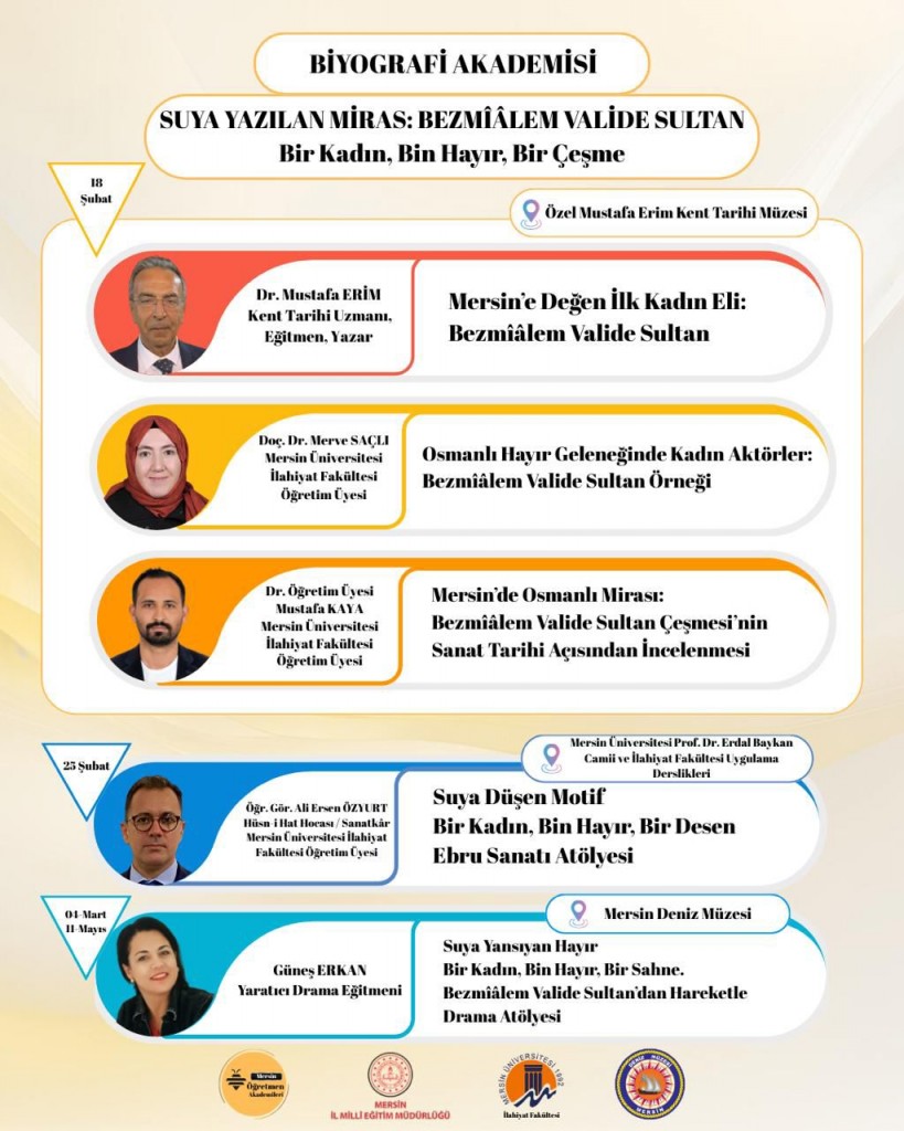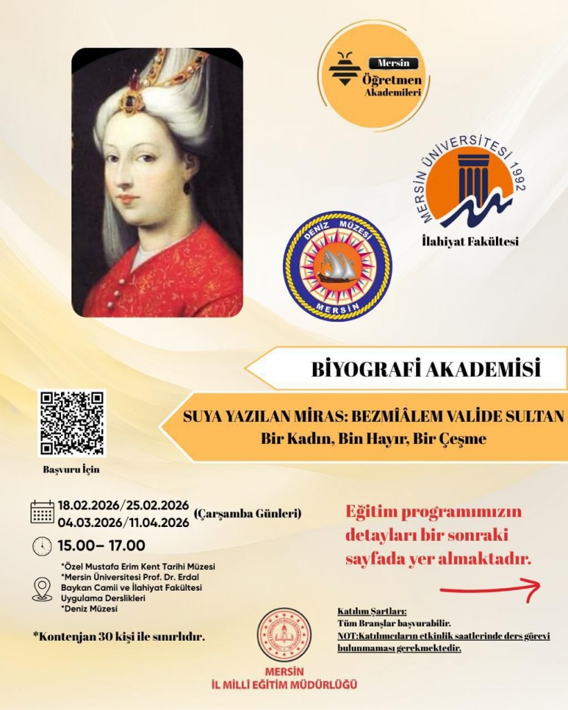 Mersin Öğretmen Akademileri kapsamında Mersin İl Milli Eğitim Müdürlüğü ve Mersin Üniversitesi İlahiyat Fakültemizin birlikte düzenlediği, 18.02.2026 tarihi 15:00-17:00 saatleri arasında Mustafa Erim Kent Tarihi Müzesi'nde gerçekleştirilen "SUYA YAZILAN MİRAS: BEZMİÂLEM VALİDE SULTAN - Bir Kadın, Bin Hayır, Bir Çeşme" konulu panelde fakültemiz öğretim üyelerinden Doç. Dr. Merve Saçlı ve Dr. Öğr. Üyesi Mustafa Kaya birer tebliğ sundular. Hocalarımızı tebrik ederiz.