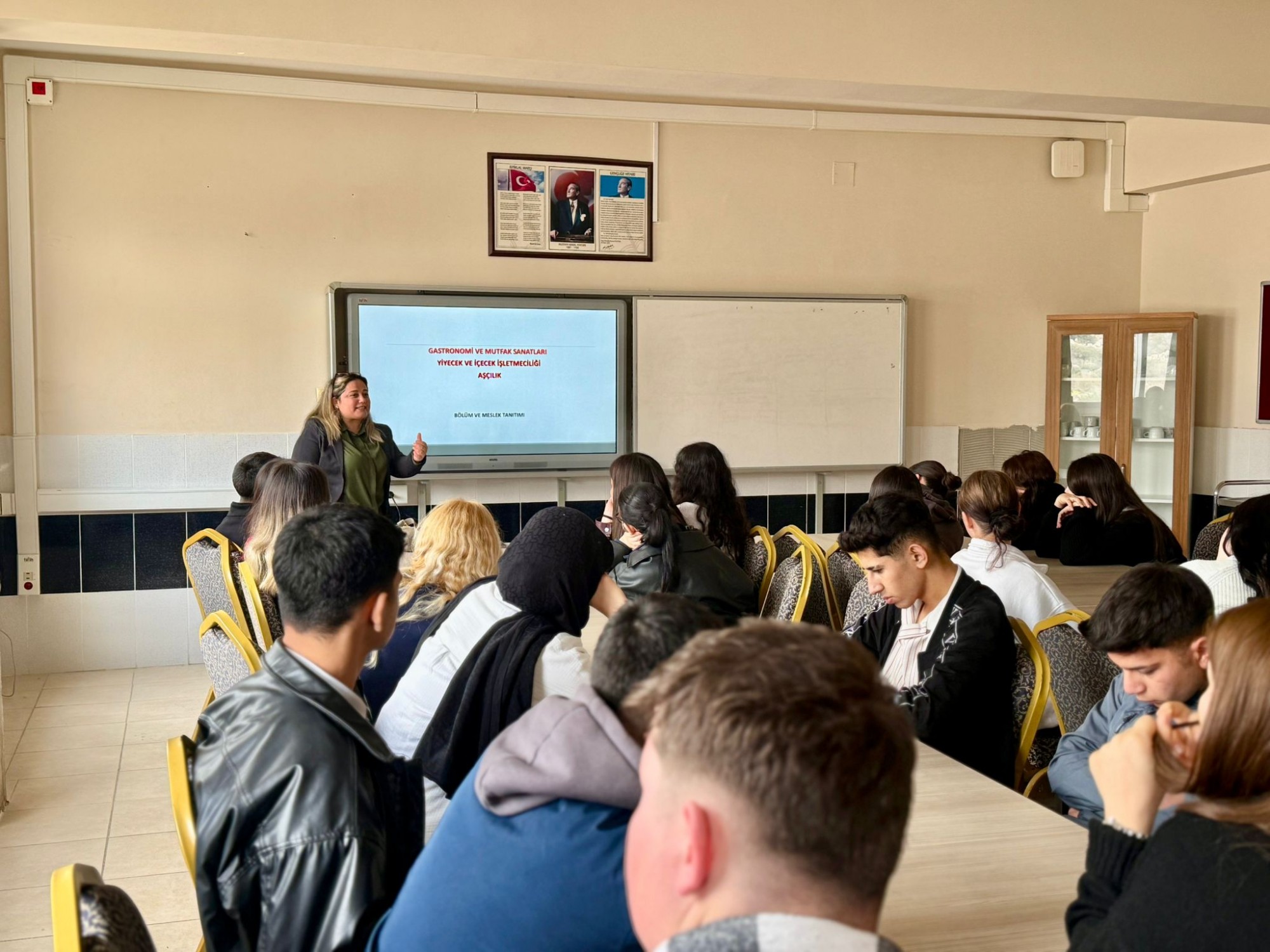 Gerçekleştirilen etkinlikte, Gastronomi Mutfak Sanatları ve Aşçılık Bölümlerini tanıtarak bölümlerin eğitim içeriği, çalışma alanları, kariyer olanakları ve sektördeki güncel gelişmeler hakkında öğrencilere bilgi verildi. Sunumda, bu alanlarda eğitim almanın gerektirdiği beceriler, çalışma koşulları ve mezuniyet sonrası istihdam imkanları ele alındı.