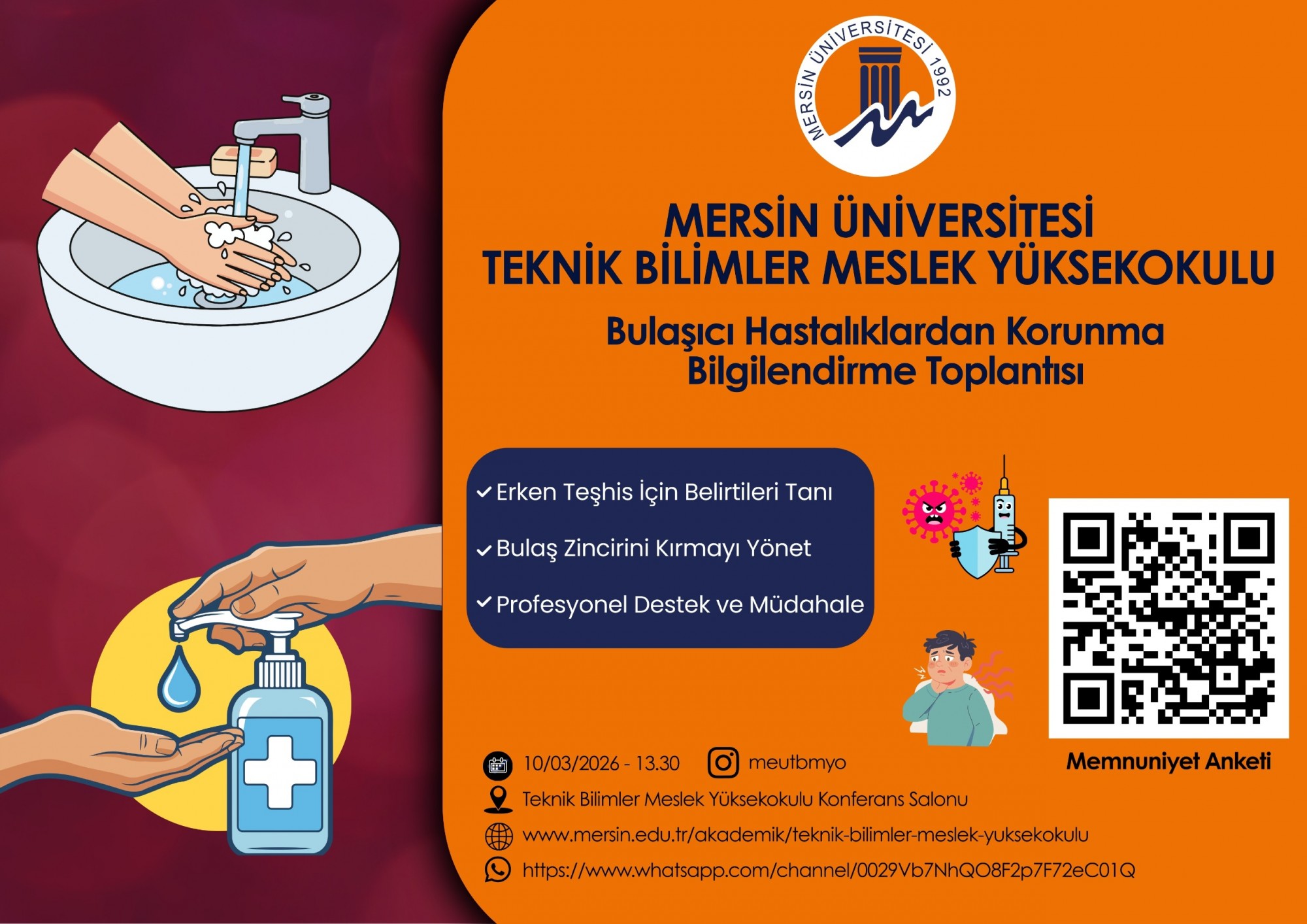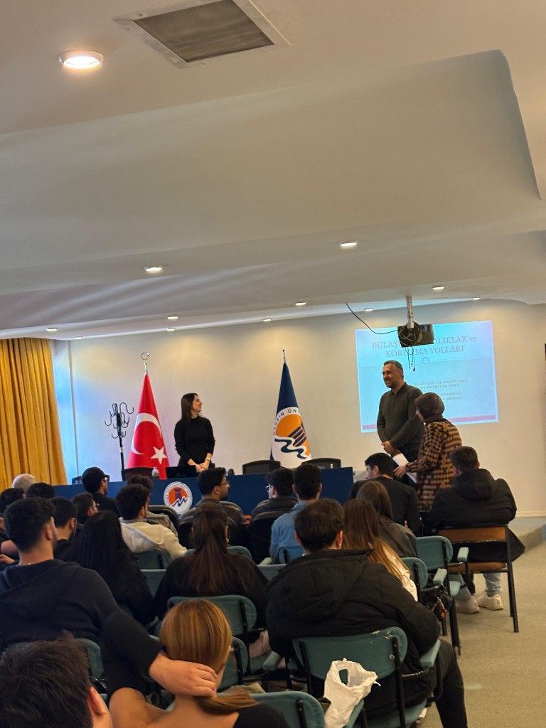 Üniversitemiz Tıp Fakültesi Dahili Tıp Bilimleri Bölümü Halk Sağlığı Anabilim Dalı ile İl Sağlık Müdürlüğü Halk Sağlığı Hizmetleri Başkanlığı iş birliğinde, üniversitemiz öğrencilerine yönelik “Bulaşıcı Hastalıklardan Korunma” konulu bilgilendirme toplantısı Meslek Yüksekokulumuz Konferans Salonunda 10 Mart 2026 tarihinde gerçekleştirilmiştir.