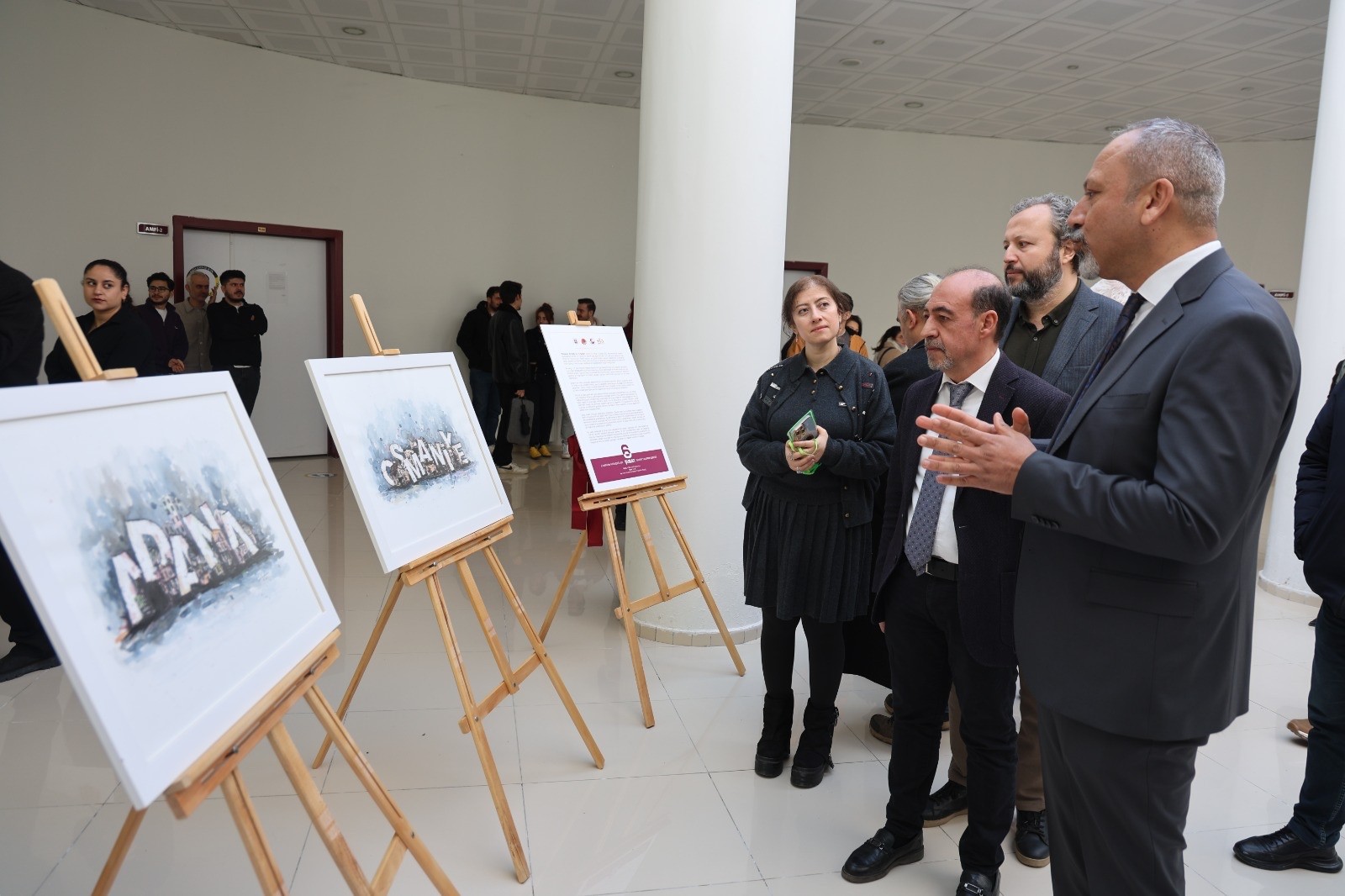 Sergi açılışında yaptığı konuşmada grafik tasarımın bir görsel iletişim sanatı olduğunu ve yalnızca estetik kaygılarla değil aynı zamanda toplumsal sorumlulukla da ilişkili olduğunu ifade eden Öğr. Gör. Dr. Acar, deprem konusunda toplumsal farkındalığın artırılmasının önemini vurguladı. Sergide yer alan 16 eserde zaman, bellek ve mekân ilişkisini, kırılmış ve parçalanmış tipografik formlar üzerinden sorgulayan bir görsel anlatı sunmayı hedeflediğini dile getiren Öğr. Gör. Dr. Acar, harflerin, okunabilir metinler olmasının yanı sıra yıkımın ve kesintiye uğrayan zamanın simgesel taşıyıcıları olarak kurgulandığını belirtti. Serginin teknik özellikleri hakkında bilgi veren Öğr. Gör. Dr. Acar şunları kaydetti: “Çalışmalar, kâğıt üzerine dijital baskı ile başlatılarak rapido kalem, fırça, mürekkep ve suluboya gibi geleneksel tekniklerle elle müdahale edilerek tamamlandı. Bu yönüyle sergi, dijital ve geleneksel üretim süreçlerini bir araya getiren karma bir üretim anlayışını yansıtmaktadır.”