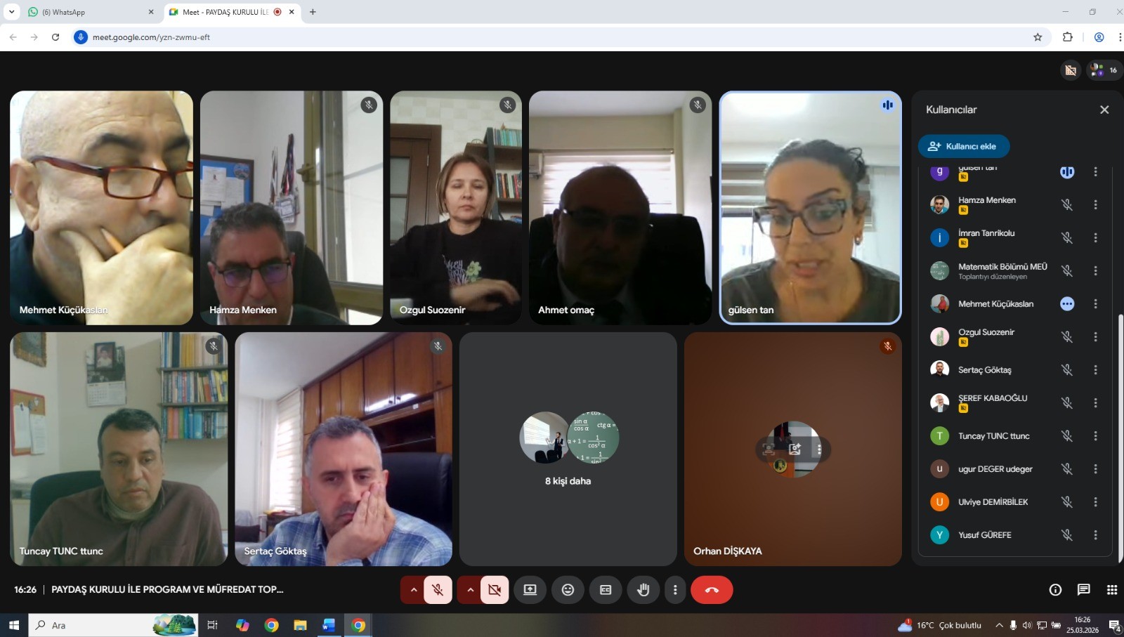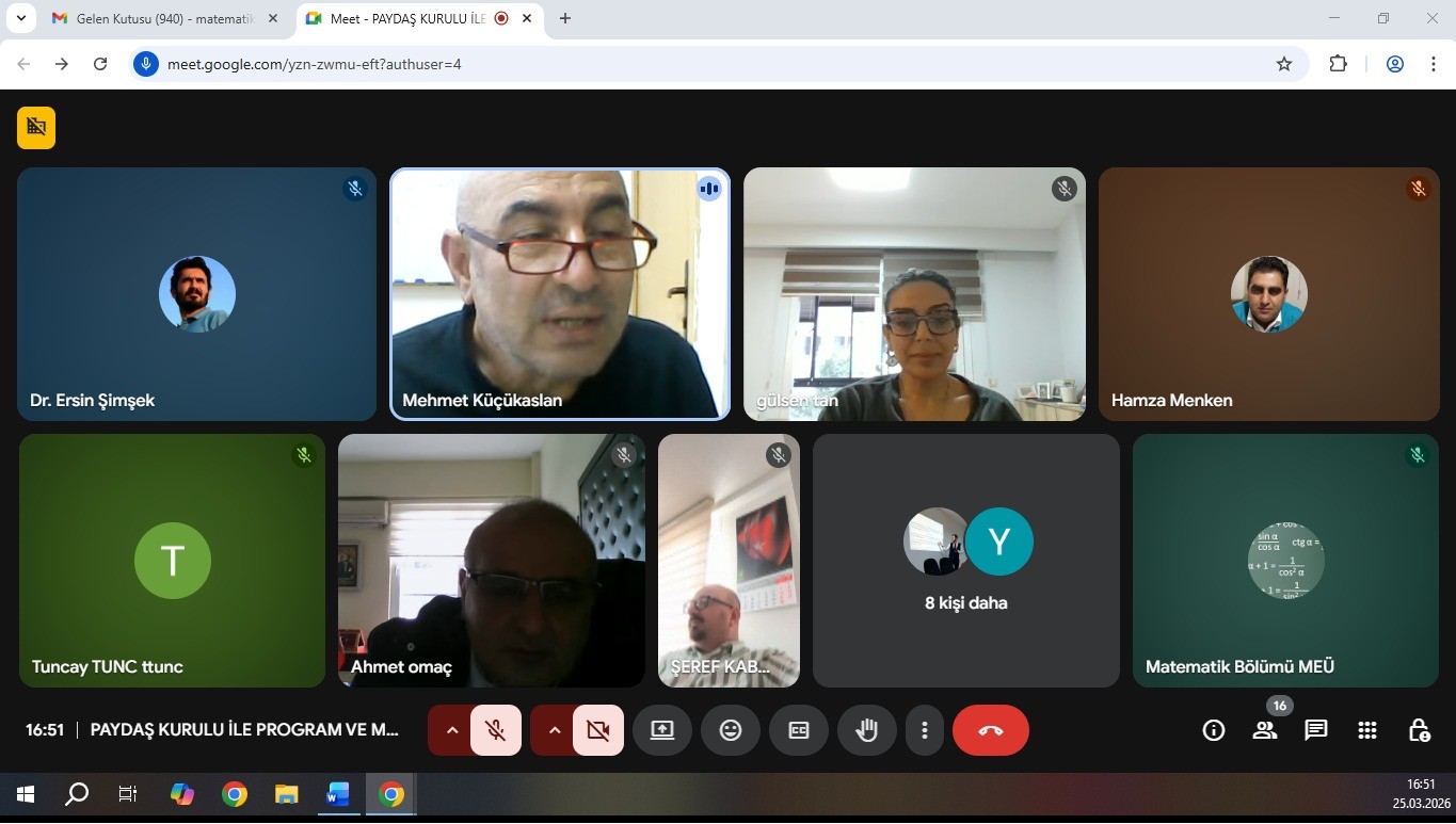 Matematik Bölümü lisans programının akreditasyon süreçlerine hazırlık kapsamında; program öğretim amaçları, program öğrenme çıktıları ve ders planı arasındaki ilişkinin değerlendirilmesi ile bu süreçlerin paydaş danışma kurulu ve mezun görüşleri doğrultusunda gözden geçirilmesi ve güncellenmesine yönelik olarak, aşağıda belirtilen katılımcılarla çevrim içi bir toplantı gerçekleştirilmiştir.