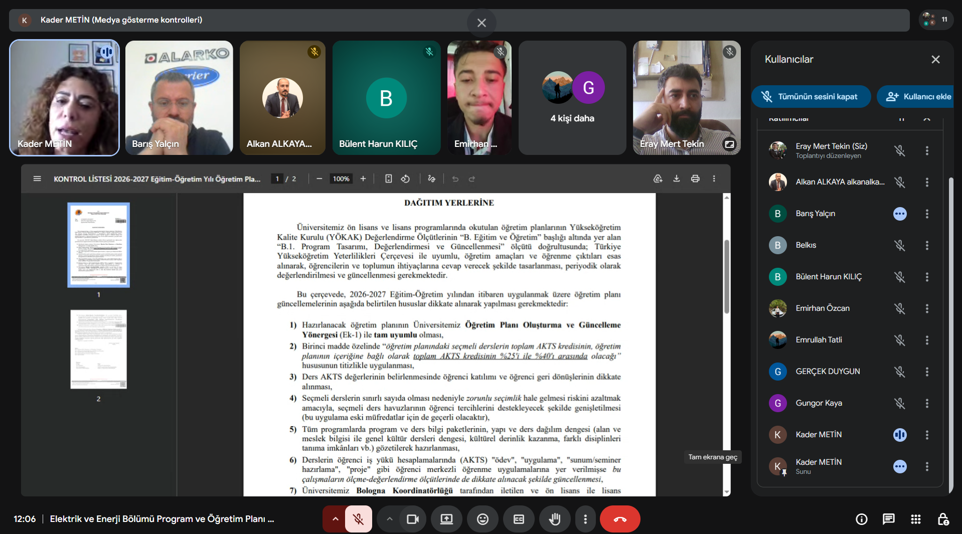 Toplantı boyunca, ders planlarının Türkiye Yükseköğretim Yeterlilikler Çerçevesi (TYYÇ) ile uyumu ve MEDEK (Mesleki Eğitim Değerlendirme ve Akreditasyon Derneği) kriterleri titizlikle incelendi. Öne çıkan diğer maddeler şunlardı: